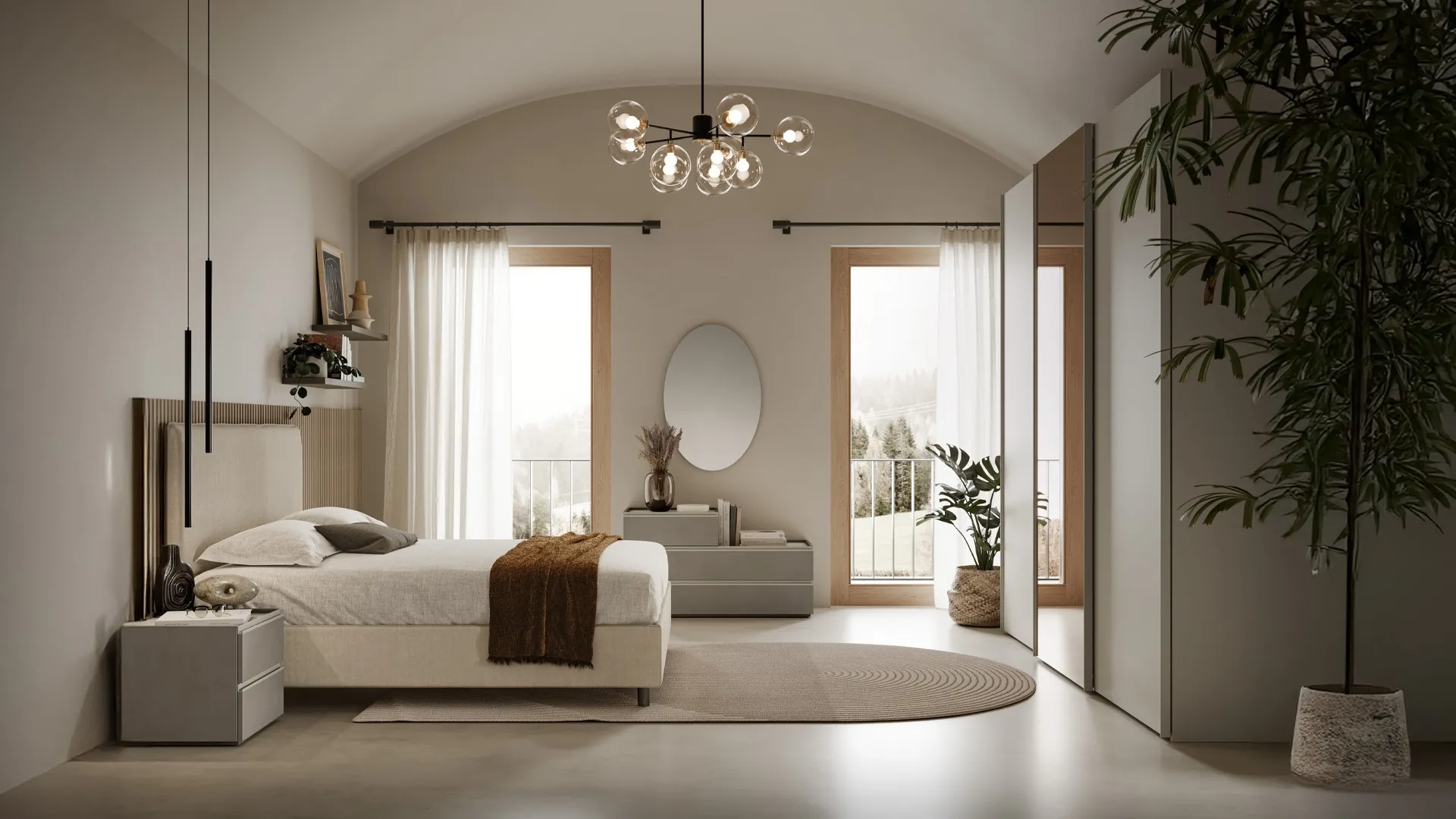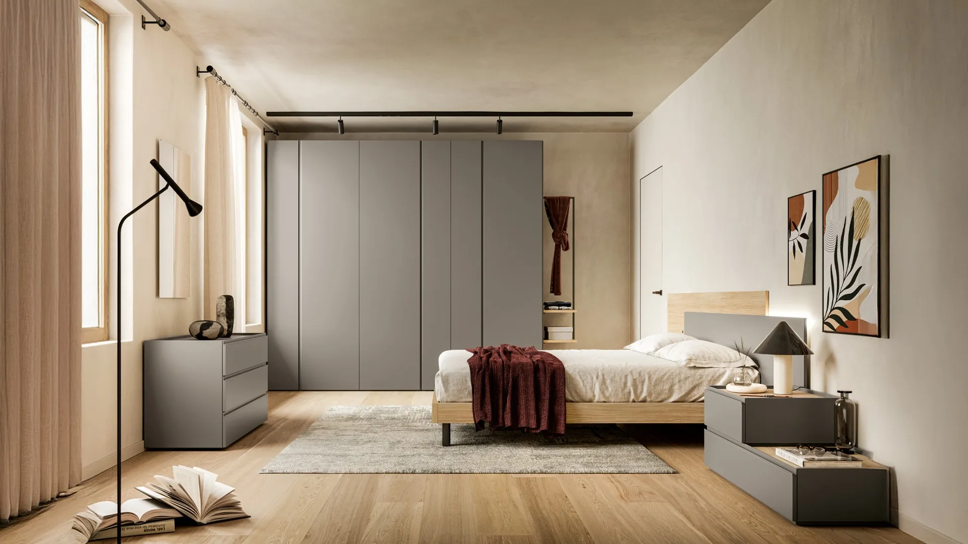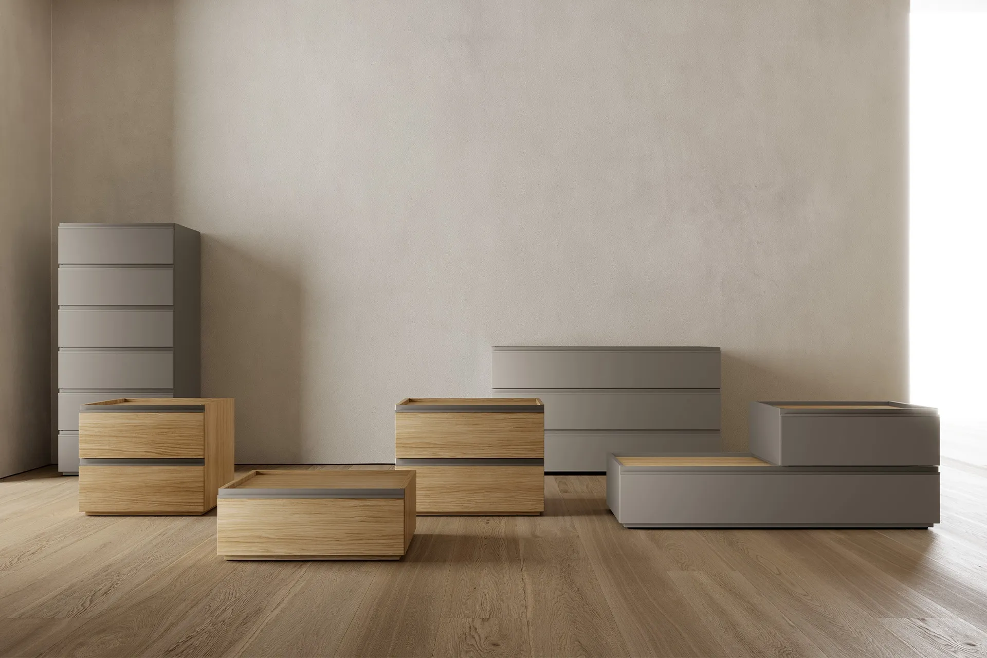 Una ricca gamma di mobili con cassetti SantaLucia: i comodini moderni in melaminico, come Sistema Modo Gruppo Notte, sono tra le soluzioni più belle.