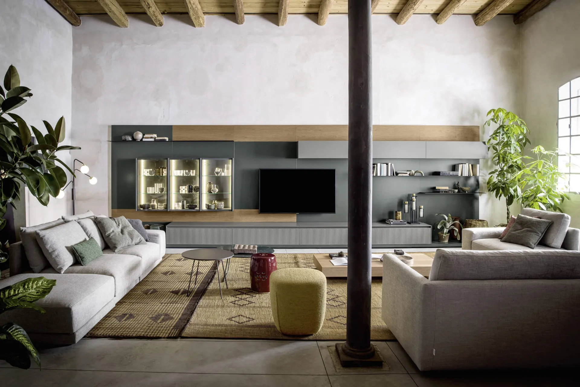 Se desideri ultimare un soggiorno pratico e dinamico dalle linee moderne, ti offriamo la parete attrezzata Boiserie 01 Novamobili.