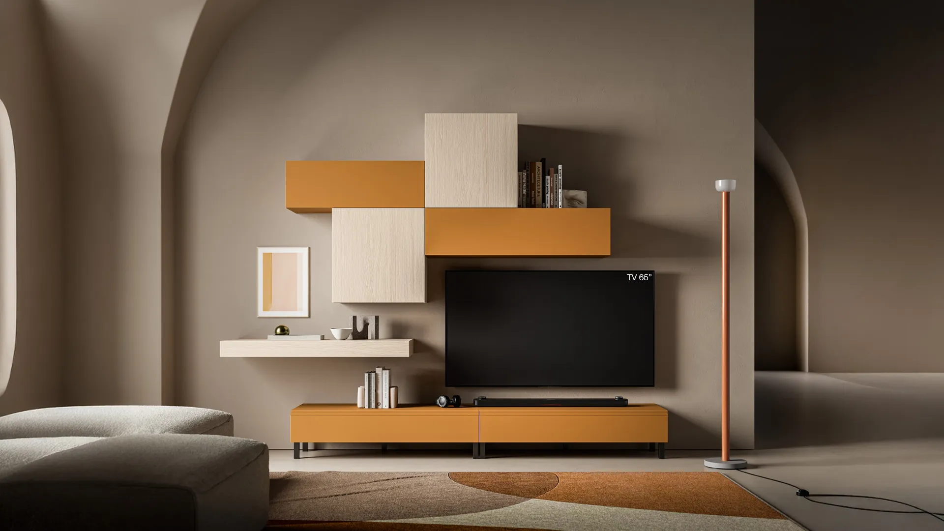 Le Pareti Attrezzate moderne consentono di creare varie ambientazioni nel living, liberando spazio e sfruttando bene ogni angolo.