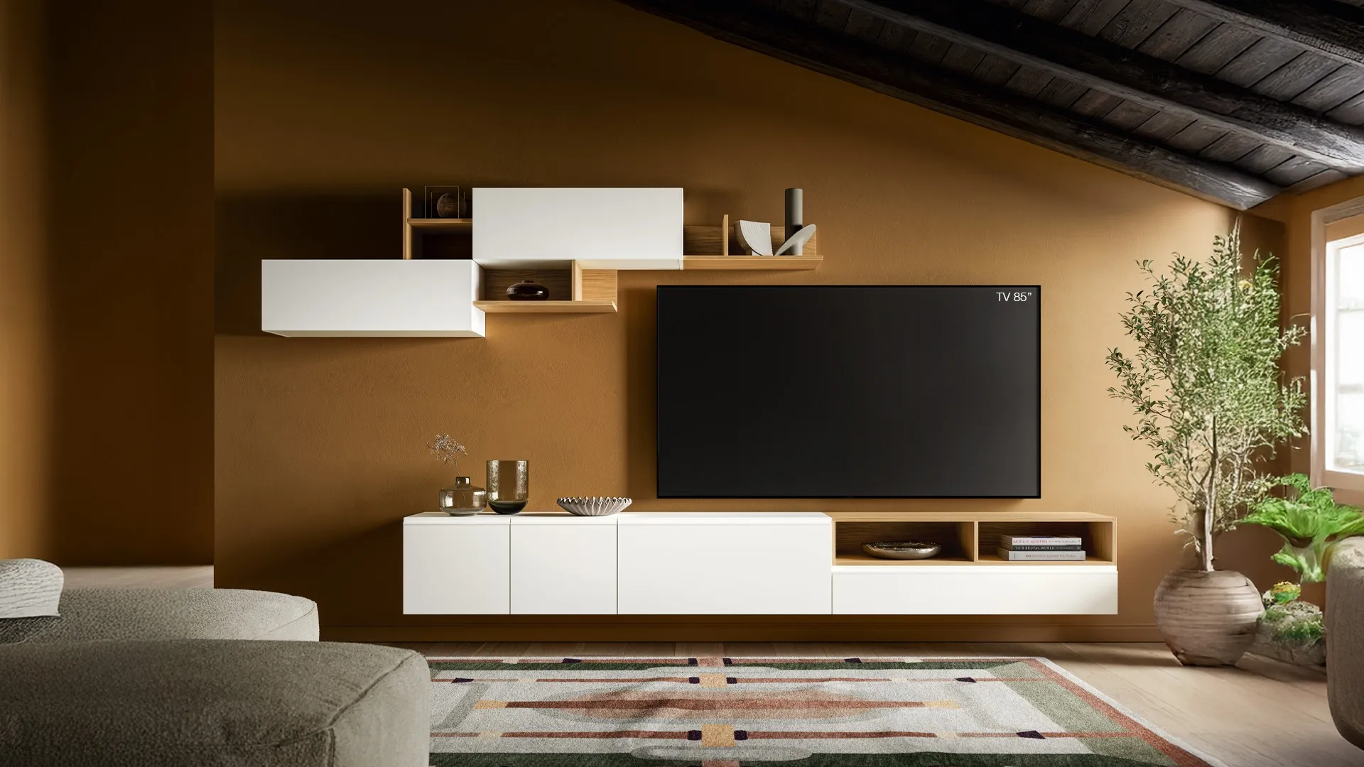 La Parete Attrezzata Pratico PTG436 di SantaLucia nell'immagine, realizzata in melaminico, risolve le più personali esigenze abitative di spazio e stile senza rinunciare alla ricerca estetica. Se cerchi mobili salvaspazio e realizzabili su misura, contattaci e scopri di più sull'Arredamento Casa dei migliori brand. Anche in un living non troppo grande, questo tipo di arredo riesce a ottimizzare gli spazi ottimizzando ogni angolo e garantendo grandi doti di componibilità tipica delle soluzioni moderne. Un po’ librerie, un po’ mobili contenitori ed espositori: le Pareti Attrezzate sono ideali per arredare un luogo pratico e dinamico.